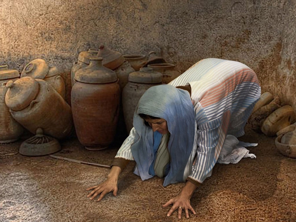 She can’t hold off until morning. She takes her oil lamp and searches every nook and cranny of her packed-earth floor. She sweeps every corner and every seam. She looks under mats and shards of pottery – once, twice, three times – always looking at things from a different angle.